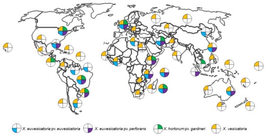 Xanthomonas biotypes causing BLS are widely distributed (Figure 3). Of these, X. euvesicatoria pv. euvesicatoria, X. euvesicatoria pv. perforans, X. hortorum pv. gardneri and X. vesicatoria biotypes causing BLS have been found in five continents (Africa, Asia, Europe, North America, and South America), while in Australia, X. euvesicatoria pv. euvesicatoria, X. euvesicatoria pv. perforans and X. vesicatoria have been isolated [20]. In the USA, it was found that predominant strains can change over time [21]. This has also been seen with other bacterial pathosystems, where pathogen populations appear to change in response to the release of host cultivars that were bred to be resistant to an earlier predominant strain [22].
