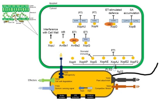 The mechanistic insight of the Type 3 secretion system in X. euvesicatoria pv. euvesicatoria. T3SS as to suppress the plant immunity, some effectors have been reported to promote the disease colonization. Some effectors have more than one role, such as XopF2, XopE2, XopAJ, XopAE [118], and XopS [119]. These effectors inhibit the flg-22 induced signalling and suppress the pattern-triggered immunity (PTI). Effectors XopAP and XopH are inhibitors of flg22-induced reporter gene activation, but the PTI-related inhibition is not known yet [107]. XopS has been reported also to stabilize pepper to regulate the defense response, stomatal immunity [119], and disease symptoms [120]. While effector AvrBsT suppresses the hypersensitive response (HR) as effect of effector protein AvrBs1 in resistant chilli plant [121]. Chilli plants carrying the Bs2 gene are resistant to X. euvesicatoria pv. euvesicatoria strains, which contain AvrBs2. The interaction between Bs2 and AvrBs2 resulted in Effector-Triggered Immunity (ETI), which led to suppression of effectors into plant cell [122]). During the infection, XopD effector is required for pathogen growth and symptom-development delay. This effector carries small ubiquitin-like modifier (SUMO) and desumoylates S1ERF4 to suppress ethylene levels, which increases susceptibility of host plant to X. euvesicatoria pv. euvesicatoria [123]. To interfere the host immune signalling, XopAU effector manipulates the host MAPK signal and activation of MKK2 [124]), while XopB interferes the PTI and suppresses SA accumulation [125]. XopN interacted with the Tomato Atypical Receptor-Like Kinase1 (TARK1) and suppresses PAMP-triggered immune response [126]. While XopJ is to inhibit the cell wall-based defense response [127].