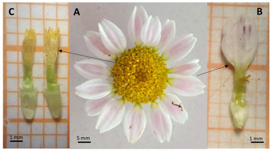 Floral organisation of the study species. (A) Flower head; (B) ligulate flower; (C) tubular flower.