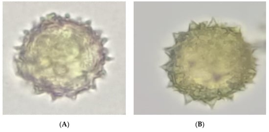 At anthesis, the stamens release a large quantity of pollen grains. Microscopic observations showed spheroidal pollen grains that were radially symmetrical, circular-polar, and equatorial in outline; they were echinulate with triangularly outlined spines tapering toward the tip and broad at the base, and densely arranged (Figure 2). This pollen type fits perfectly with the allogamous strategy and has adapted to be transported by pollinators.