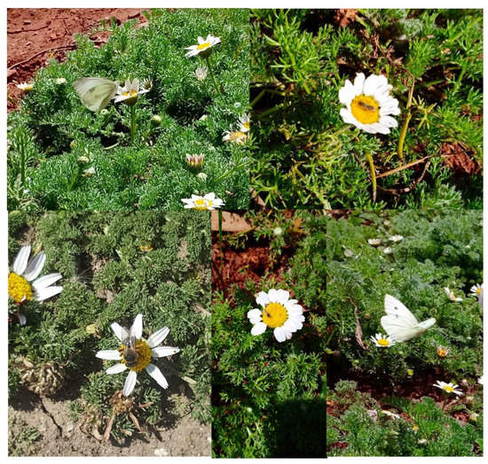 Among the pollinators observed, species belonging to the orders Araneidae and Lepidoptera were identified only in the stations of the variety A.P. var. pyrethrum; Dermaptera were represented only in the stations of the variety A.P. var. depressus. Asteraceae are generally pollinated by several groups of insects such as Diptera, Coleoptera, and Hymenoptera [72,73,74,75,76] as the main function of ray flowers in most Asteraceae species is related to pollinator attraction [77]. Therefore, they have a marked effect on outcrossing rates and fitness [17,77,78,79,80,81,82]. The pollen grains released by the two varieties A.P. var. pyrethrum and A.P. var. depressus are spheroidal, radially symmetrical, and echinulate with densely arranged spines, which makes them suitable for adherence to insect vectors [83]. The pollinators of the two varieties belonged mainly to Coleoptera and Hymenoptera.