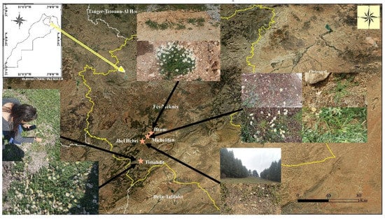 - Ouarghidi, A.; Powell, B.; Martin, G.J.; Abbad, A. Traditional Sustainable Harvesting Knowledge and Distribution of a Vulnerable Wild Medicinal Root (Anacyclus Pyrethrum Var. Pyrethrum) in Ait M’hamed Valley, Morocco. Econ. Bot. 2017, 71, 83–95. [Google Scholar] [CrossRef]