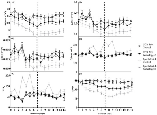Waterlogging treatments significantly affected the gas exchange parameters measured over the 7-day waterlogging and 7-day recovery period, depending on the genotype and duration of stress (Figure 1A–E, significant ‘genotype × treatment’ and ‘treatment × duration’, but not significant ‘genotype × duration’, and ‘genotype × treatment × duration’ interactions in Table 2). In UCR 369, waterlogging did not affect the stomatal conductance (gs) until 6 DOW, while the gs of EpicSelect.4 significantly declined by 41% at 1 DOW (Figure 1B). Figure 1C shows the mirrored decrease in E over time for UCR 369 and EpicSelect.4 in control and waterlogged plants. Maintenance of E and gs in UCR 369 compared to EpicSelect.4 suggests that water uptake continues due to open stomata until 6 DOW in UCR 369 (Figure 1B,C). In agreement, the A of UCR 369 was maintained up to 5 DOW but significantly decreased by 41% at the end of the waterlogging period (Figure 1A). This result contrasted with EpicSelect.4, where A significantly declined by 42% after 2 DOW and reached 2.07 µmol m−2 s−1 by 6 DOW compared to 14.30 µmol m−2 s−1 for control plants (Figure 1A). EpicSelect.4 did not restore gs, E, and A during the recovery, whereas the same parameters were statistically comparable to the control treatment in UCR 369 (Figure 1A–C).