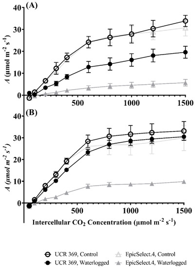 (A) Response of the CO2 assimilation rate (A) to increasing intercellular CO2 concentration (Ci) (A/Ci Curve) in the two cowpea genotypes (UCR 369 and EpicSelect.4) after 7 days of control and waterlogging treatments; (B) A/Ci Curve in the two cowpea genotypes (UCR 369 and EpicSelect.4) after 7 days of recovery. The vertical bars represent the standard error of the mean (n = 5).