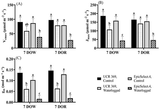 We used the A/Ci data of cowpea genotypes displayed in Figure 2 to estimate the mesophyll gm, Vcmax, and Jmax at both 7 DOW and 7 DOR. Waterlogging significantly affected the calculated Vcmax at 7 DOW. On average, UCR 369 had a significantly higher Vcmax of 90.22 µmol m−2 s−1 than EpicSelect.4 (86.52 µmol m−2 s−1) under control treatments (Figure 3A). Contrasted with nonwaterlogged plants, UCR 369 and EpicSelect.4 significantly reduced Vcmax by 31% and 48%, respectively, at 7 DOW. However, genotype and waterlogging treatment independently and significantly affected gm and Jmax. Specifically, waterlogging significantly affected the gm and Jmax of UCR 369 by 55% and 34%, respectively, and by 85% and 73%, respectively, in EpicSelect.4 (Figure 3B,C). In addition, the gm, Vcmax, and Jmax declined in cowpea genotypes at 7 DORs, especially in EpicSelect.4, where gm, Vcmax, and Jmax significantly decreased by 83%, 65%, and 70%, respectively, in relation to the control plants. It is interesting to note that the values of gm, Vcmax, and Jmax of waterlogged UCR 369 after 7 DOR were statistically similar to the control plants (Figure 3).
