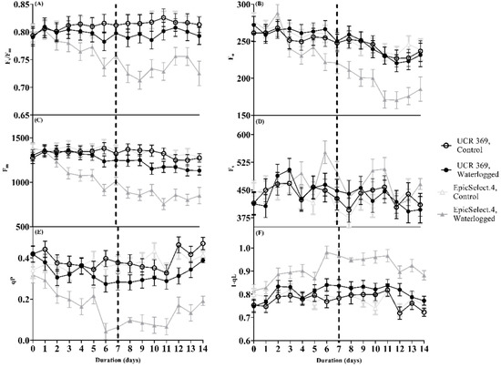 (A) Maximum quantum efficiency of PSII in dark-adapted state (Fv/Fm), (B) Initial fluorescence (Fo), (C) maximum fluorescence (Fm), (D) Steady-state fluorescence (Fs), (E) Redox state of the plastoquinone pool (qP), and (F) Redox State of Plastoquinone Pool Based on the Lake Model (1-qL) of control and waterlogged cowpea genotypes (UCR 369 and EpicSelect.4) during and after 7 days of treatment. The dashed vertical lines in (A–F) demarcated the waterlogging from the recovery period. The error bar on the line graph indicates the standard error of the mean ± 5 replications of each leaf gas exchange trait. Standard error of the mean, Fv/Fm = 0.16; Fo = 11.50; Fm = 63.30; Fs = 30.81; qP = 0.39; 1-qL = 0.027.
