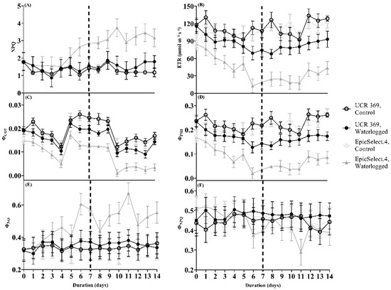 (A) Non-photochemical quenching (NPQ), (B) Electron transport rate (ETR), (C) Quantum yield of CO2 fixation (ΦCO2), (D) Effective quantum yield of PSII (ΦPSII), (E) Quantum yield of non-regulated energy dissipated in PSII (ΦNO), and (F) Quantum yield of regulated non-photochemical energy loss in PSII (ΦNPQ) of control and waterlogged cowpea genotypes (UCR 369 and EpicSelect.4) during and after 7 days of treatment. The dashed vertical lines in (A–F) demarcated the waterlogging from the recovery period. The error bar on the line graph indicates the standard error of the mean ± 5 replications of each leaf gas exchange trait. Standard error of the mean, NPQ = 0.51; ETR = 11.68; ΦCO2= 0.0016; ΦPSII = 0.023; ΦNO = 0.066; ΦNPQ = 0.066.