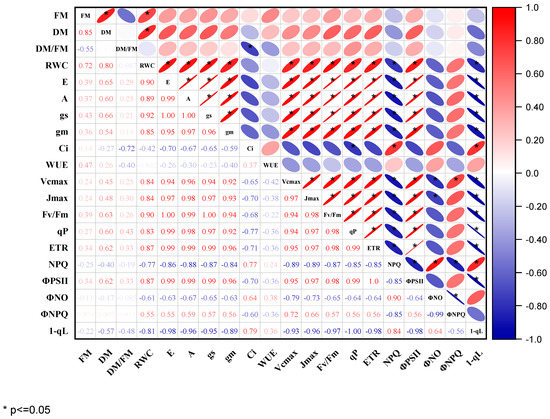 Pearson’s correlation matrix of the changes in biomass, gas exchange, and chlorophyll fluorescence parameters of the two cowpea genotypes under control and waterlogging treatments. Dark color represents strong correlations, and light background color represents weaker correlations. Values close to zero indicate no correlation, and values close to one indicate a strong correlation (positive—red and negative—blue) between two parameters. * Represent correlation coefficient significance levels at p ≤ 0.05. Where FM = fresh mass, DM = dry mass, RWC = relative water content, E = transpiration rate, A = CO2 assimilation rate, gs = stomatal conductance, Ci = intercellular CO2 concentration, WUE = water use efficiency, Vcmax = maximum rate of Rubisco carboxylation efficiency, Jmax = maximum rate of photosynthetic electron transport, Fv/Fm = maximum quantum efficiency of PSII in dark-adapted state, qP = photochemical quenching, ETR = electron transport rate, NPQ = non-photochemical quenching, ΦPSII = actual photochemical efficiency of PSII, ΦNO = quantum yield of non-regulated energy dissipated in PSII, ΦNPQ = quantum yield of regulated non-photochemical energy loss in PSII, 1-qL = redox State of Plastoquinone Pool based on the Lake Model.