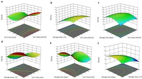 Figure 1. shows the three-dimensional (3D) response surface blot of TSS affected by the storage conditions, and the UV-C treatment and storage conditions. Increasing the UV-C dose slightly increased the TSS to the maximum level at 4 kJ/cm2 and then reduced it at a higher UV-C dose (Figure 1a–c). In addition, increasing the storage time greatly increased the TSS to the highest value at 15 days and then reduced it as the time elongated to 21 days (Figure 1c,e,f). However, increasing the storage temperature and the UV-C exposure time reduced the TSS of the Barhi to the minimum values at 2.8 min and 25 °C, respectively (Figure 1a,b,d–f). The increase in TSS in Barhi dates during storage time and UV-C treatment could be due to the loss of water and degradation of the polysaccharides, and similar observations were reported in Kiwi fruit treated with UV-C radiation and stored at different temperatures and durations [24]. In addition, the disruption of the cell wall matrix by UV-C might lead to the liberation of soluble solids and, in addition, might accelerate the ripening process and thereby increase the TSS of the Barhi fruits during storage. The reduction of the TSS during increased UV-C exposure time and storage temperature could be due to the inhibition of polysaccharide-degrading enzymes and thermal caramel formation [16]. When compared to the UV-C treatment dose and period, the storage temperature and time had a greater impact on raising the TSS, which suggests that the UV-C treatment slowed the decay of the Barhi dates. Similar to this, other findings suggest that mangoes’ TSS gradually increased but was slowed by the UV-C treatment, [25] likewise cherry tomatoes [26].
