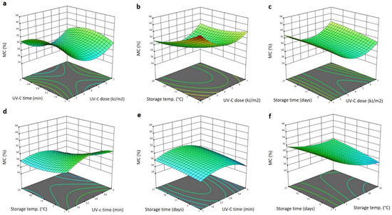 Response surface plots of moisture content (MC) of Barhi dates as a function of UV-C time and UV-C dose (a), storage temperature and UV-C dose (b), storage time and UV-C dose (c), storage temperature and UV-C time (d), storage time and UV-C time (e), and storage time and storage temperature (f).
