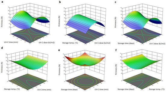 Response surface plots of firmness of Barhi dates as a function of UV-C time and UV-C dose (a), storage temperature and UV-C dose (b), storage time and UV-C dose (c), storage temperature and UV-C time (d), storage time and UV-C time (e), and storage time and storage temperature (f).
