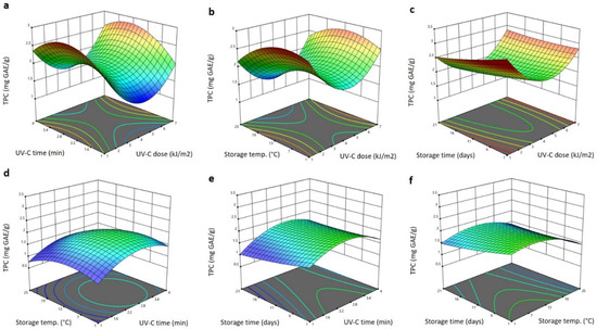 Response surface plots of total phenolic content (TPC) of Barhi dates as a function of UV-C time and UV-C dose (a), storage temperature and UV-C dose (b), storage time and UV-C dose (c), storage temperature and UV-C time (d), storage time and UV-C time (e), and storage time and storage temperature (f).
