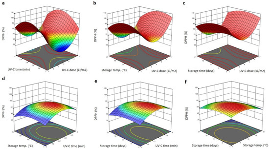 Response surface plots of DPPH antiradical activity of Barhi dates as a function of UV-C time and UV-C dose (a), storage temperature and UV-C dose (b), storage time and UV-C dose (c), storage temperature and UV-C time (d), storage time and UV-C time (e), and storage time and storage temperature (f).