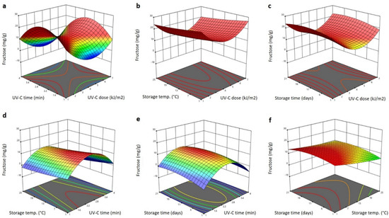 The significant terms for fructose affected by the UV and storage treatments are shown in Table 1. They were linear (p < 0.05) terms of the storage temperature (negative effect), the interaction terms of the UV-C dose and storage temperature (p < 0.05; negative effect), the storage time and UV-C dose (p < 0.01; positive effect), the storage time and temperature (p < 0.05; positive effect), the quadratic terms of the UV-C dose (p < 0.05; positive effect) and the UV-C exposure time (p < 0.01; negative effect). The other factors were not significant; therefore, they were excluded from the following polynomial equation for fructose: