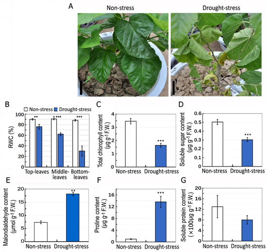 2.1. Physiological and Biochemical Characterization of the Mulberry under Drought Stress