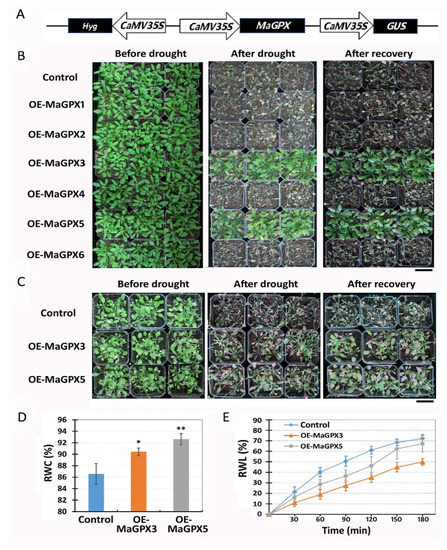 - Zhang, L.; Wu, M.; Teng, Y.; Jia, S.; Yu, D.; Wei, T.; Chen, C.; Song, W. Overexpression of the Glutathione Peroxidase 5 (RcGPX5) gene from Rhodiola crenulata increases drought tolerance in Salvia miltiorrhiza. Front. Plant Sci. 2018, 9, 1950. [Google Scholar] [CrossRef]