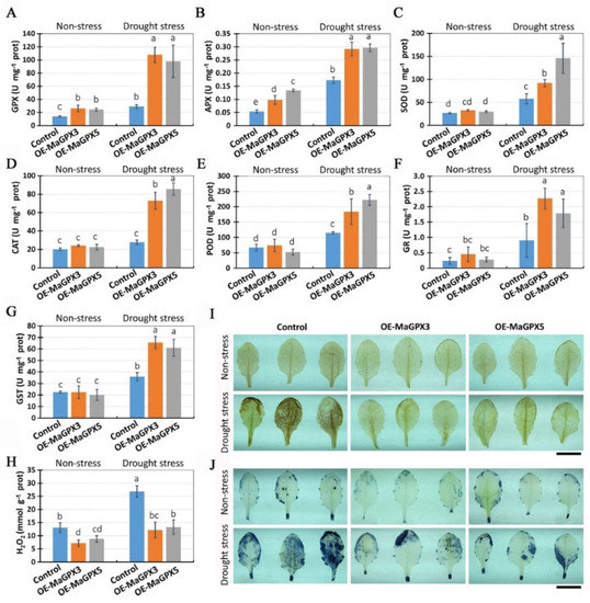 2.6. Ectopic Overexpression of Mulberry GPX Isoforms Improve Both Antioxidant Enzymatic Activities and ROS Scavenging in Transgenic Arabidopsis under Drought Stress