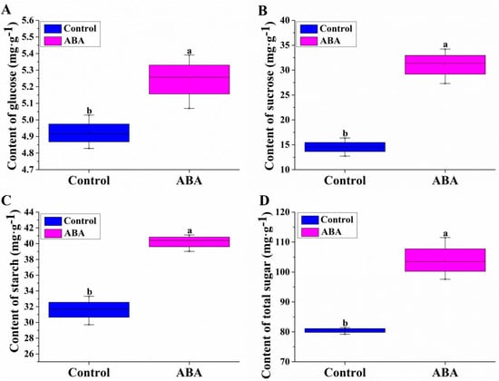 Figure 1. Effects of exogenous 0.05 μM ABA on glucose (A), sucrose (B), starch (C) and total sugar (D) contents in hypocotyls of cucumber. The values (means ± SE) are the averages of the three independent experiments. The different letters above the bars indicate significant differences (p < 0.05) according to one-way ANOVA and t test.