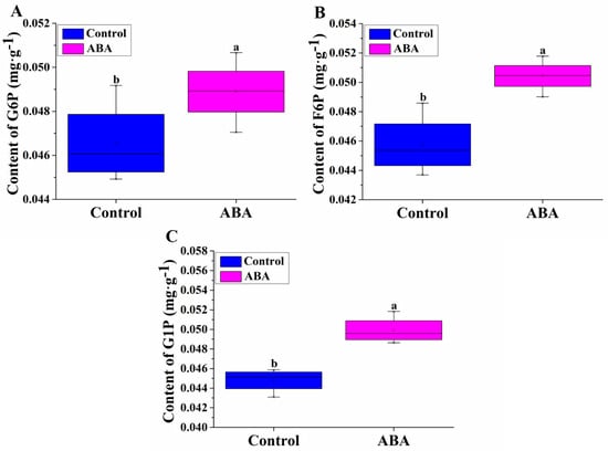 Figure 2. Effects of exogenous 0.05 μM ABA on G6P (A), F6P (B) and G1P (C) contents in hypocotyls of cucumber. The values (means ± SE) are the average concentrations of the three independent experiments. The different letters above the bars indicate significant differences (p < 0.05) according to one-way ANOVA and t test. G6P, glucose-6-phosphate; F6P, fructose-6-phosphate; G1P, glucose-1-phosphate.