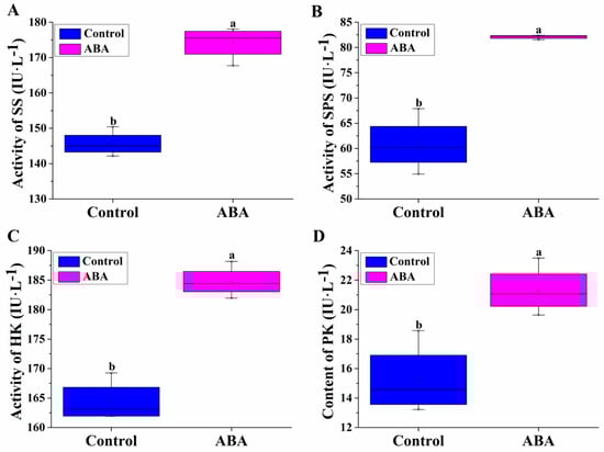 To examine the promotion roles of ABA in SS, SPS, HK and PK activities in detail, we determined the activities of SS, SPS, HK and PK in ABA-treated/untreated hypocotyls. ABA treatment significantly enhanced the SS, SPS, HK and PK activities with respect to the control by increasing 19.61%, 34.97%, 16.38% and 39.96%, respectively (Figure 3). These data revealed that ABA regulated the SS, SPS, HK and PK activities in the sugar synthesis pathway.
