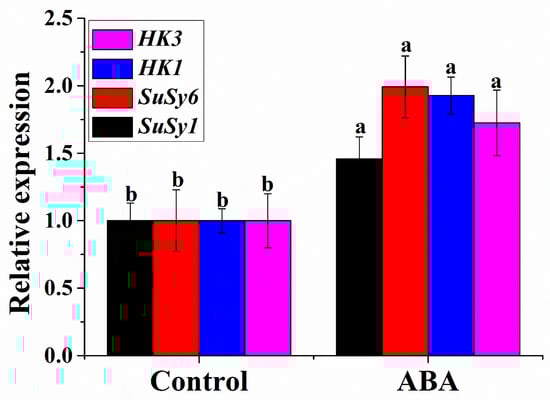 Figure 4. Effects of exogenous 0.05 μM ABA on the expression levels of CsSuSy1, CsSuSy6, CsHK1 and CsHK3 genes in hypocotyls of cucumber. The values (means ± SE) are the averages of three independent experiments. The different letters above the bars indicate significant differences (p < 0.05) according to one-way ANOVA and t test.