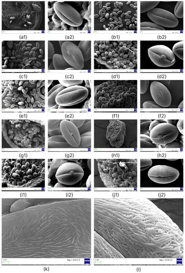SEM micrographs of N. sibirica pollen. Collection sites of the photographed specimens: (a1,a2) Dauria; (b1,b2) Shelek; (c1,c2) Balansor; (d1,d2) Karatal; (e1,e2) Balhash (f1,f2) Kurti; (g1,g2) Kosh-Agach; (h1,h2) Taskarasu; (i1,i2) Basshi; (j1,j2) Koktal; (k) Kosh-Agach, details of the exine surface; and (l) Basshi, details of the exine surface.