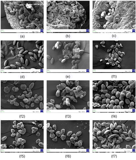 SEM micrographs of Nitraria pollen. (a) N. sibirica; (b) N. komarovi; (c) N. pamirica; (d) N. tangutorum; (e) N. praevisa; (f1–f7) N. shoberi from (f1) Balhash, (f2) Kulunda, (f3) Malinovoe, (f4) Karatal, (f5) Basshi, (f6) Taskarasu, and (f7) Sariozek.
