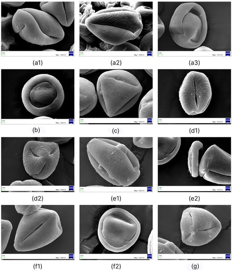 Deformed pollen grains of N. schoberi from (a1–a3) Kulunda, (b) Malinovoe, (c) Karatal, (d1,d2) Basshi, (e1,e2) Sariozek, (f1,f2) Taskarasu, and (g) Balhash.