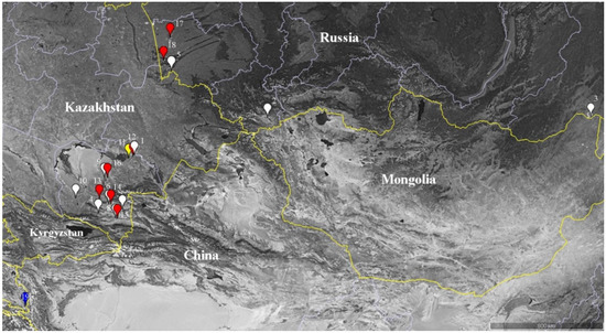 The map of sampling sites of species from the genus Nitraria. White color, N. sibirica; red color, N. schoberi; yellow color, N. komarovii; and blue color, N. pamirica.