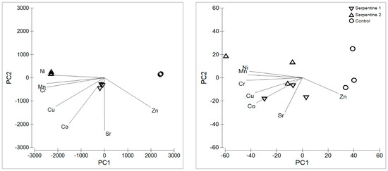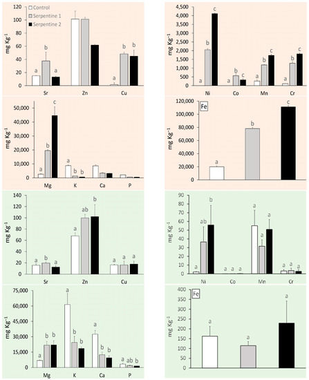 The serpentine soil contained the expected heavy metal and macronutrient levels for this type of ultramafic substrate (Appendix A) [15,16]. With the exception of Zn, heavy metals were all significantly higher in the serpentine soil treatments (Figure 1). Cr, Ni and Mn were the main contributors to the distribution and grouping of the soil samples among treatments (Table 1; Figure 2). These metals usually result from metasomatised and hydrothermally altered ultramafic rocks, from which serpentine soils derive [15,17]. The macronutrient Mg was significantly higher in the serpentine soils, whereas K was higher in the control. The pH was neutral in the control and near neutral in the serpentine soils, as expected [16]. Heavy metal concentrations in B. radula leaves differed regarding Ni, Sr and Zn—all higher in plants grown in the serpentine soils. The distribution of the concentrations was similar to that of the soils, with Ni, Mn and Zn as the main elements driving the grouping. Macronutrients Ca, K and P were higher in the control treatment, which reflected their lower availability in serpentine soil.