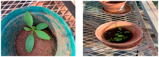 Developmental features were measured as follows: (1) germination rate—proportion of germinated seeds per pot for each treatment (seed germination recorded when hypocotyl breaks though the soil surface); (2) leaf count; (3) leaf length—measured from the base to the apex of the leaves; and (4) plant biomass—plants were harvested and dried in an oven at 60 °C for 72 h and then weighed on a precision scale.