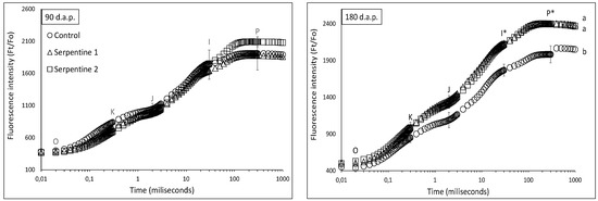 Chlorophyll a fluorescence transients (mean ± std) of B. radula leaves for the study treatments. Different lowercase letters indicate significant difference among treatment curves. * significantly different turnover steps among treatments (Tukey; p < 0.05).