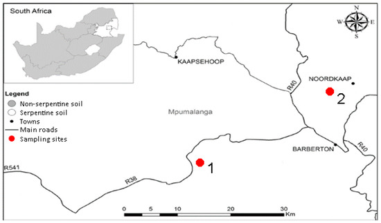 Two sampling sites were chosen along the Barberton Greenstone Belt in South Africa. The first sampling site (S 25°49.501′ E 30°48.430′), referred to as ‘serpentine 1′, was situated in grassland surrounded by pine plantations and was rich in moist red laterite soil (Figure 5). The second sampling site (S 25°40.021′ E 31°02.584′), referred to as ‘serpentine 2′, and was located in a savanna surrounded by mines on dry, rocky, grey soil. Soil was collected at a depth of 20 cm and 40 kg was collected from each site.