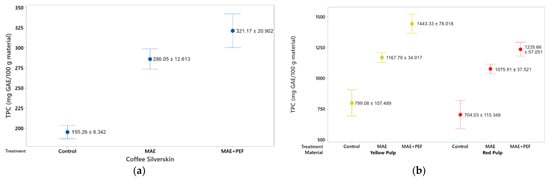 When compared to available literature, the polyphenolic yield of the MAE + PEF extraction used in this study is shown to have matching results to those other strategies for polyphenol extraction. Machado et al. [54] obtained 347 mg GAE/100 g of coffee parchment using a solid-state fermentation with Penicillinum purpurogenum, a comparable yield to the obtained in this study (321.17 mg GAE/100 g coffee parchment) with the benefit of reduced treatment times (total fermentation time = 6 days) and process scalability [54]. Another applicable comparison is the conventional aqueous extraction carried out by Narita and Inouye for coffee parchment [55]. Although the yield is doubled the obtained in this study, processing times increase from 15 min to 1 h (700 mg GAE/100 g coffee parchment, 80 °C, 1 h). While organic compounds, such as ethanol and methanol are considered the optimal solvents to extract phenolic compounds [56], the presented methodology can be posed as a quick, green strategy to enhance phenolic yield and antioxidant content using water as the main process solvent. In the case of coffee pulps, this study shows reduced yields to the approach used by Kusumocahyo et al. [57], a solid-liquid extraction carried out at 60 °C and 60 min (2612 mg GAE/100 g coffee pulp). Nevertheless, the process involves a two-step extraction using n-hexane and a mixture of water and ethanol to optimize its extraction yield.