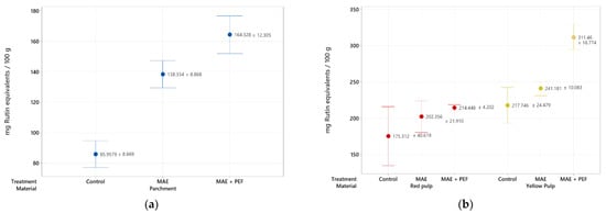 A specific assessment on the impact of the proposed techniques in flavonoid recovery was carried out and is reported in Figure 2. The same upward trend observed on the extraction yield of total phenolic content is present in this assay, where yellow pulp, once again, shows the highest TFC of these family of compounds (311.46 ± 16.774 mg of rutin equivalents/100 g of material). Despite the highest yields for all three materials being obtained for the combination of MAE and PEF treatments, its overall effect is less pronounced than in the assessment of total phenolic content. This trend may be explained by the distribution of distinct phenolic families that the residue contains and the impact of the analyzed techniques on their extraction.