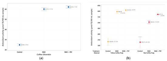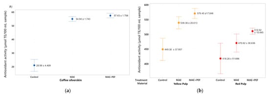 Previous studies have reported a significant decrease of antioxidant activity when increasing the temperature of extraction for infusions [60] and other conventional solid-liquid extraction methods in coffee residues and other matrixes [27,61] due to the thermolability of the extracted compounds. The combination of MAE + PEF shows no such detriment to radical scavenging at the studied conditions. The increase of antioxidant potential with the raised temperature of a microwave process using only water as a solvent is a trend that has been observed previously for coffee parchment subjected to conventional and subcritical extractions by Narita and Inouye [55].