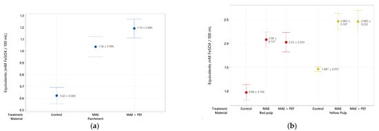 FRAP antioxidant assay of coffee agro-waste extracts. Values are represented as mean ± standard deviation (n = 3). (a) Assay results for parchment waste. (b) Assay results for yellow and red pulp waste. MAE: Microwave assisted extraction; PEF: Pulsed Electric Field pretreatment.