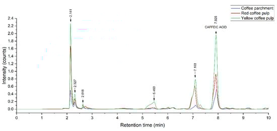 The composition of the extracts from yellow and red pulps and coffee parchment was examined and quantified through HPLC-DAD to determine their prevalent phenolic species. Figure 6 shows the chromatographic profile of the three residues, and Figure 7 shows the effect of each treatment on a particular substrate, namely yellow pulp.