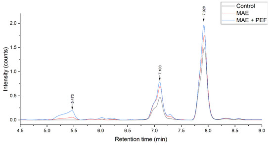 Effect of MAE + PEF treatment on the peaks of yellow coffee pulp. MAE: Microwave assisted extraction; PEF: Pulsed Electric Field pretreatment.