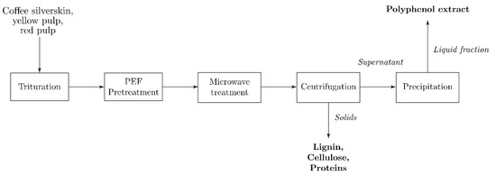 Along with MAE, pulsed electric field pretreatment (PEF) is an emerging technique that has been applied to enhance mass transfer from agro-waste through cell membrane permeabilization by short electric pulses [48,49]. Its quick and mild conditions pose PEF as an energy-efficient, non-thermal method to recover thermolabile compounds from vegetal matrices [50,51]. This technique has already been explored for coffee parchment by Barbosa-Pereira et al. [52], highlighting its potential to enhance the yield of bioactive compounds to industrial feasibility. PEF is also a robust technique that is optimizable through the control of its main variable inputs: pulse frequency, voltage, and treatment duration [53].