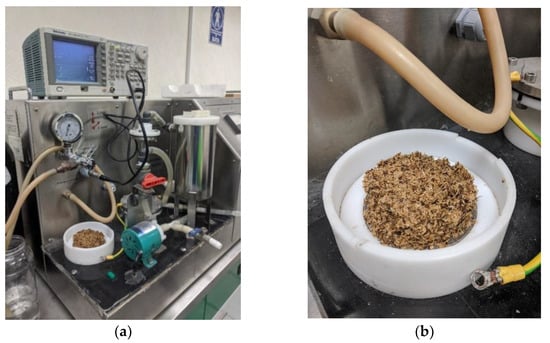 15 g of each analyzed coffee residue were dampened with 15 mL of distilled water until a consistent texture was obtained. The material was then placed in the batch processing chamber of an SBS-PEF-SA-1 PEF Benchtop Sterilization System (SteriBeam Systems, Kehl, Germany) (Figure 8), covering the entirety of its exposed electrode surface (Figure 9). Operating conditions for the pretreatment were set at a total treatment time of 5 min, pulse frequency of 5 Hz, and pulse voltage of 18 kV (6 kV/cm). PEF-pretreated samples were then subjected to microwave-assisted extraction, as described in the following section. The procedure was performed in triplicate.