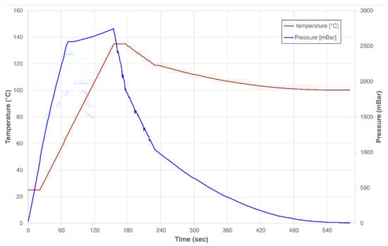 Briefly, 15 g of each residue were suspended in 150 mL of distilled water in a 500 mL capped flask. MAE was performed using a Microjet™ Autoclave (Rodwell Group Ltd., Essex, UK) using the equipment settings preset for the given solution volume. The pressure and temperature of the process were monitored using the system’s equipped sensors (Figure 10). After treatment, the mixture was shaken in a Labline Scientific 3527 Orbital Incubator Shaker (Mumbai, India) at 170 rpm and room temperature for 1 h. The solid residue was then decanted from the liquid fraction. The recovered liquid was centrifuged using a Sigma 3–18 KS refrigerated benchtop centrifuge (Osterode am Harz, Germany) (8000 rpm, 30 min) to remove suspended sediments. The supernatant was then filtered using Grade 40 GE Healthcare Whatman™ 47 mm glass fiber filters (Cytiva, Marlborough, MA, United States). The volume of the resulting extract was measured, and 2 equivalent volumes of 96% ethanol were added to precipitate its polysaccharide fraction. The precipitated polysaccharide was filtered using commercial #4 paper cone filters, and the liquid component was recovered for its characterization through the techniques described below. The described methodology was followed to produce a triplicate of PEF-treated and non-PEF-treated samples for experimental comparison. PEF + MAE-untreated samples were produced following the solid-liquid extraction steps of this procedure to be used as controls.