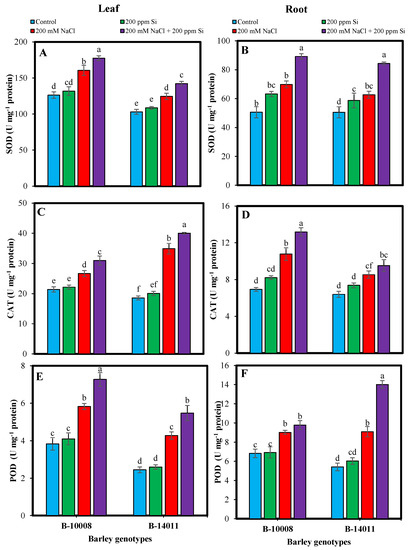 Superoxide dismutase (SOD) (A,B), catalase (CAT) (C,D) and peroxidase (POD) (E,F) (U mg−1 protein) contents in leaf and root of barley genotypes modulated by application of silicon through rooting media under salinity stress. The values represented by bars are means of four replicates ± SE. Different small letters (a–f) on bars denote significant difference at p ≤ 0.05 (Duncan’s multiple range test). Values sharing same letter within each subfigure are non-significant statistically.