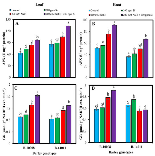 Ascorbate peroxidase (APX) (A,B) (Umg−1 protein) and glutathione reductase (GR) (C,D) (µmol g−1 NADPH ext. min−1) contents in leaf and root of barley genotypes modulated by application of silicon through rooting media under salinity stress. The values represented by bars are means of four replicates ± SE. Different small letters (a–e) on bars denote significant difference at p ≤ 0.05 (Duncan’s multiple range test). Values sharing same letter within each subfigure are non-significant statistically.