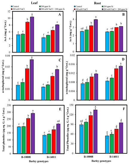 It has been observed that Si application under salinity stress more prominently enhanced α-tocopherol contents in leaf (29%) and root (13%) of genotype B-10008 while highest total phenolics contents in leaf (24%) and root (26%) was observed in B-14011 at same growing conditions. Similarly, the genotype B-14011 accumulated maximum leaf AsA (25%) while B-10008 showed highest root AsA (24%) contents after application of Si through rooting media under salinity stress (Figure 4).