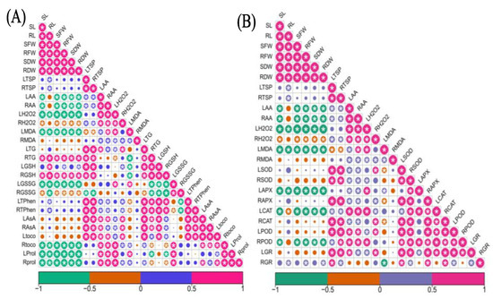Pearson correlation analysis of different measured attributes of barley genotypes (B10008 and B14011) with non-enzymatic (A) and enzymatic (B) antioxidants modulated by application of silicon through rooting media under salinity stress. Asterisk (*) denotes significance of the interaction at p ≤ 0.05. Color of circles corresponds, i.e., Red: highly positive; Purple: slightly positive; Green: highly negative; Brown: slightly negative. Circle intensity or size shows the strength of correlation: stronger (Bigger) or weaker (Smaller). SL: shoot length; RL: root length; SFW: shoot fresh weight; RFW: root fresh weight; SDW: shoot dry weight; RDW: root dry weight; LTSP: leaf total soluble protein; RTSP: root total soluble protein; LAA: leaf free amino acids; RAA: root free amino acids; LH2O2: leaf hydrogen peroxide; RH2O2: root hydrogen peroxide; LMDA: leaf malondialdehyde; RMDA: root malondialdehyde; LTG: leaf total glutathione; RTG: root total glutathione; LGSH: leaf reduced glutathione; RGSH: root reduced glutathione; LGSSG: leaf oxidized glutathione; RGSSG: root oxidized glutathione; LTPhen: leaf total phenolics; RTPhen: root total phenolics; LAsA: leaf ascorbic acid; RAsA: root ascorbic acid; Ltoco: leaf α-tocopherol; Rtoco: root α-tocopherol; LProl: leaf proline; Rprol: root proline; LSD: leaf superoxide dismutase; RSOD: root superoxide dismutase; LAPX: leaf ascorbate peroxidase; RAPX: root ascorbate peroxidase; LCAT: leaf catalase; RCAT: root catalase; LPOD: leaf peroxidase: RPOD: root peroxidase: LGR: leaf glutathione reductase; RGR: root glutathione reductase.