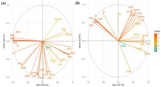 The angle between LH2O2 and LProl; LMDA and LGSSG; RH2O2 and RMDA; LMDA and LGSSG (Figure 6A) and SFW, SDW, RFW, RDW, SL and RL and in PCA (Figure 6A,B) showed that there exist a strong positive. It has been observed that RH2O2 and RGSSG exhibited no relationship between these two components. Similarly, the data presented in Figure 6B revealed that there is a strong positive correlation between LH2O2 and LAPX; LTSP, LSOD, LPOD, LGR, RTSP, RAPX, RCAT, RAPX and RSOD, RH2Os and RPOD and LH2O2 and LCAT, while the angle between LH2O2 and morphological attributes showed that a strong negative correlation exists. The representation of RMDA showed that it had a little contribution in both PCAs (Figure 6A,B).