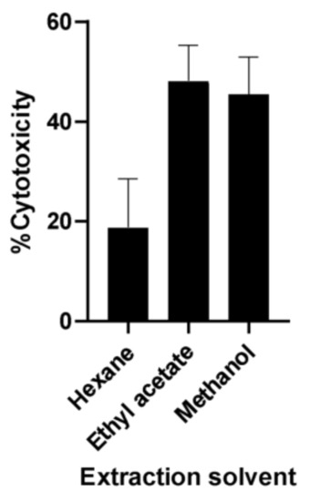 MTT assay screening of crude extracts from A. muricata leaves extracted using hexane, ethyl acetate, and methanol.