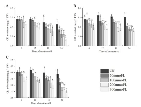 As shown in Figure 1, the content of Chl a, Chl b, and Chl a+b in the leaves of J. microcarpa L. declined with an increase in the NaCl concentration at the same stress time. At 6 days of salt stress, compared with the control, the content of Chl a, Chl b, and Chl a+b decreased by 8.27%, 31.17%, and 14.63%, respectively, where Chl a content was not significantly different among treatments, and Chl b and Chl a+b contents were significantly different from that of the control at 300 mmol/L. At 12 days of salt stress, the content of Chl a, Chl b, and Chl a+b decreased by 14.25%, 40.30%, and 22.20%, respectively, compared with the control. At 18 days of salt stress, the content of Chl a, Chl b, and Chl a+b decreased by 17.45%, 38.98%, and 24.12%, respectively, compared with the control. At 24 days of salt stress, the above indices were significantly different among the treatments, which decreased by 29.44%, 47.68%, and 35.23%, respectively, compared with the control.
