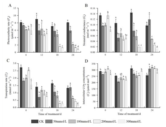 Effect of salt stress on the photosynthetic parameters of J. microcarpa L. seedlings. (A) Photosynthetic rate (Pn), (B) stomatal conductance (Gs), (C) transpiration (Tr), and (D) intercellular CO2 concentration (Ci) in the leaves. Error bars indicate the SD of treatment means. Different letters on the bars indicate significant differences among the treatments (p < 0.05).
